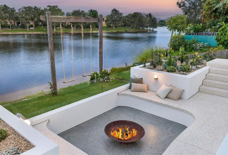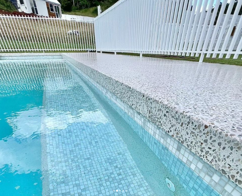This project was created by Coulsons Concrete Finishes in full stone exposure non slip honed concrete to pool surrounds, stairs, fire pit and steppers in Nucon's White Glacier.